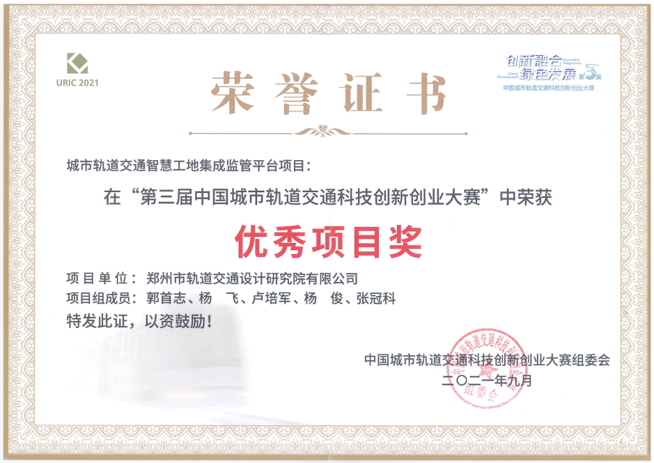 軌道設(shè)計(jì)院城市軌道交通智慧工地集成監(jiān)管平臺(tái)項(xiàng)目榮獲“第三屆中國(guó)城市軌道交通科技創(chuàng)新創(chuàng)業(yè)大賽”優(yōu)秀項(xiàng)目獎(jiǎng)。